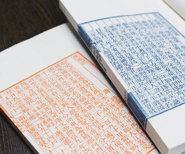 与此同时,《吴地记》的新雕工作也在同步推进。雕版的担纲者是广陵书社的老朋友——国家级雕版非遗传承人陈义时与雕版工艺大师陈美琦父女二人。陈家是著名的雕版世家,技艺世代相传。陈义时从事雕版60余年,并曾在广陵古籍刻印社工作多年,此次负责监制把关;陈美琦是中青年一代中的领衔者,技艺炉火纯青,负责具体的雕版工作。底本选用了南京图书馆藏同治江苏书局刻本,26个筒页,全帙完好。获得授权,处理好图片,交到陈美琦老师手中,正式开工雕造。因为版片要用于展览,选择了单面雕刻,背面刻有两位大师的名款。不久后,陆续收到陈美琦老师送来的宣纸样稿,一张张摊开,朱砂盈纸,刀工遒劲,犹如身在古代刻书现场。别看底本的宋体字横平竖直,转折清爽,但听陈老师介绍,这其实是非常难刻的字体,凝神运刀,一下都马虎不得。雕版必须反刻文字,刷印出来才是正的,故而笔画阙衍,在所难免。校对时,认真比勘每一个文字,细到一笔一画。需要修改之处,便在样稿上圈出,交还给陈老师,重新挖改、修整版片。两部旧版各刷印200套,新雕《吴地记》刷印红印本、蓝印本各200套,墨印本500套,数量庞大。三部书都选用了精致考究的用料,纯手工泾县宣纸,洁白如玉,高品质传统墨汁,馨香淡雅。在开本上,做了一些改变,目验南图藏本《吴地记》,开本大约高260毫米左右,宽仅能容下刷印的版面,未免局促小气。这次刷印采用285×190的开本,天头、地脚更加开阔疏朗,版框距订口也更远,正符合曾国藩当年要求金陵书局《文选》初印十部“天地宜极长”“两边钉边处之阔,大约如此”的豪华配置。刷好的纸页全部手工装订,此外,还有函套、题签的制作。考虑到红、蓝、墨三色元素,设计了红黑元素的扉页,签条红黑配色,配上蓝布函套、瓷青纸面,恰好表达了红、蓝、墨三色,内外呼应,表里如一。可以说,相对于百年前书局刷印售卖的正式版本,这一次的用料和制作,应该算是同一版本、不同印次里的“顶流”了!