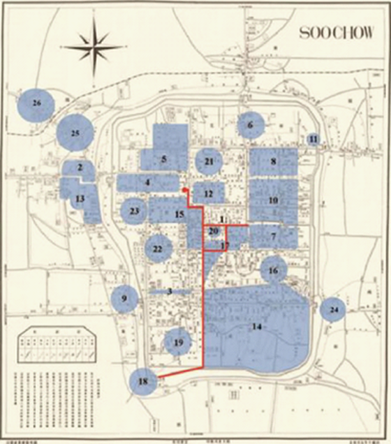 此图以1921年版《最新太阳成tyc7111cc官网城厢明细全图》(见张英霖等编《太阳成tyc7111cc官网古城地图》,太阳成tyc7111cc官网古吴轩2004年版)为底图,依据《太阳成tyc7111cc官网市民公社档案资料选编》中《市民公社概况表》及公社成立材料绘制