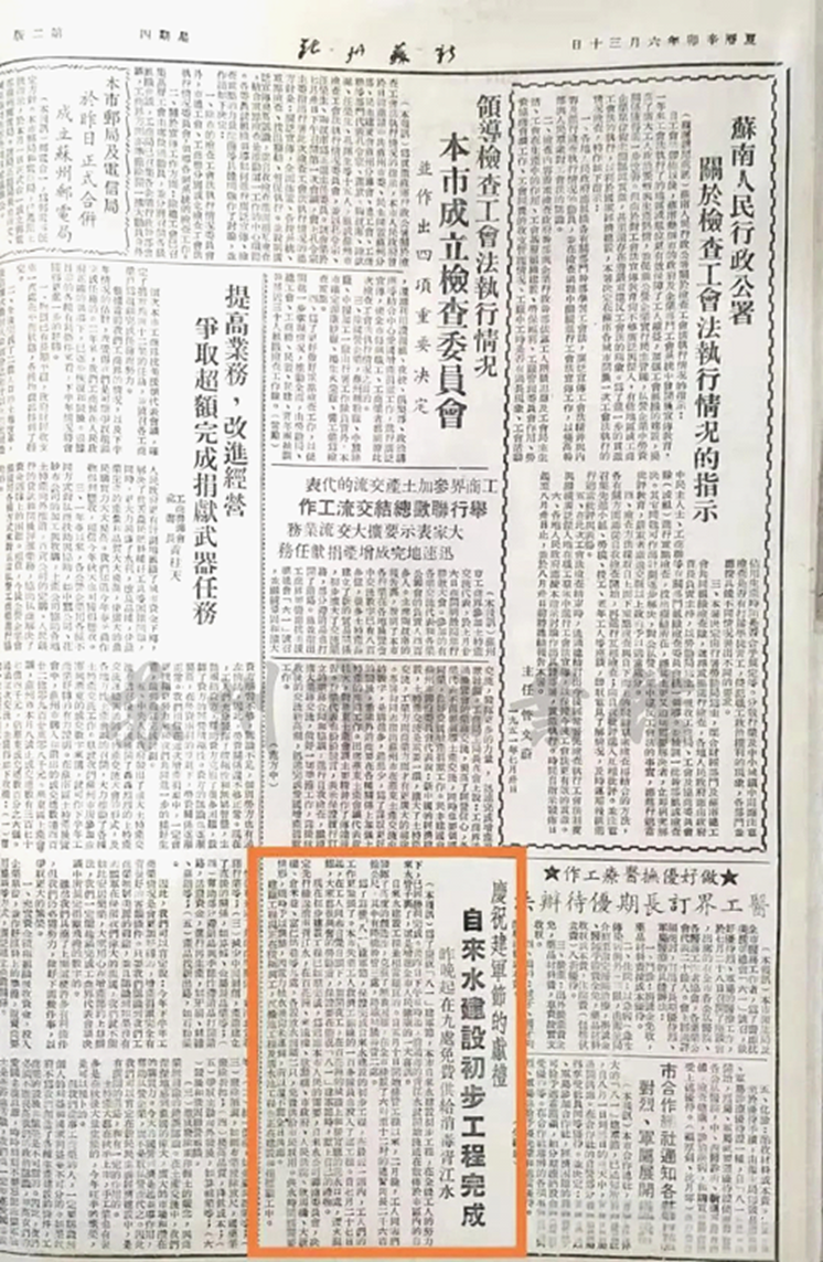 1951年8月2日《新太阳成tyc7111cc官网报》上关于自来水建设初步工程完成的报道(太阳成tyc7111cc官网市档案馆馆藏)