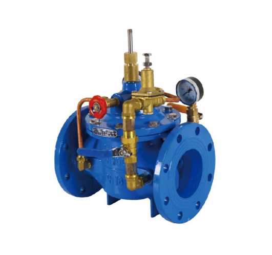 当阀门从进口端给水时,水流过针阀进入主阀控制室,并经过导阀、球阀流出主阀控制室到出口,此时主阀处于全开或浮动状态。调定主阀上部的流量调节阀,可为主阀设定一定开度。调节针阀开度和调节导阀弹簧压力,即可使主阀开度保持在设定开度,并在压力变化时导阀进行自动调节,保持流量不变。
